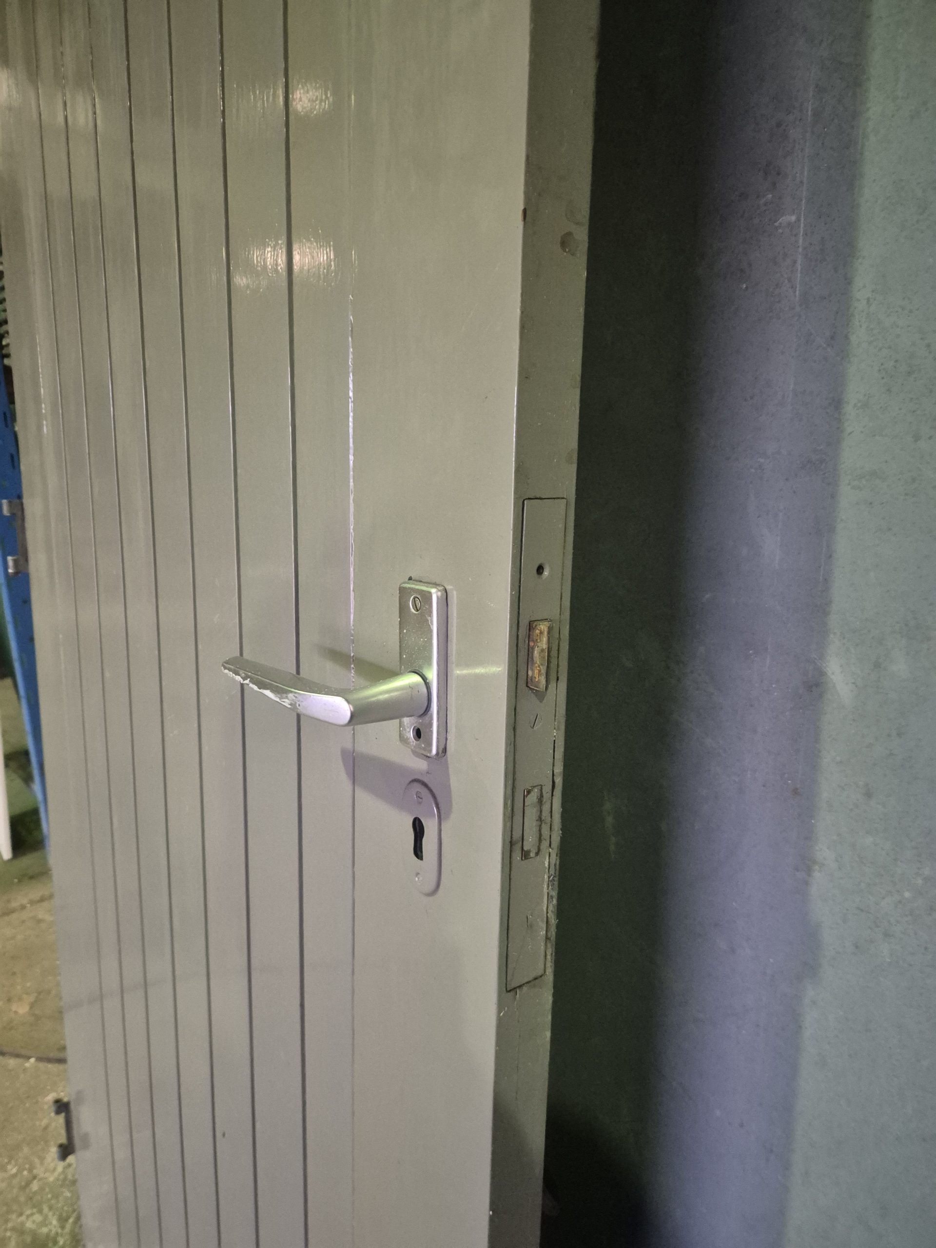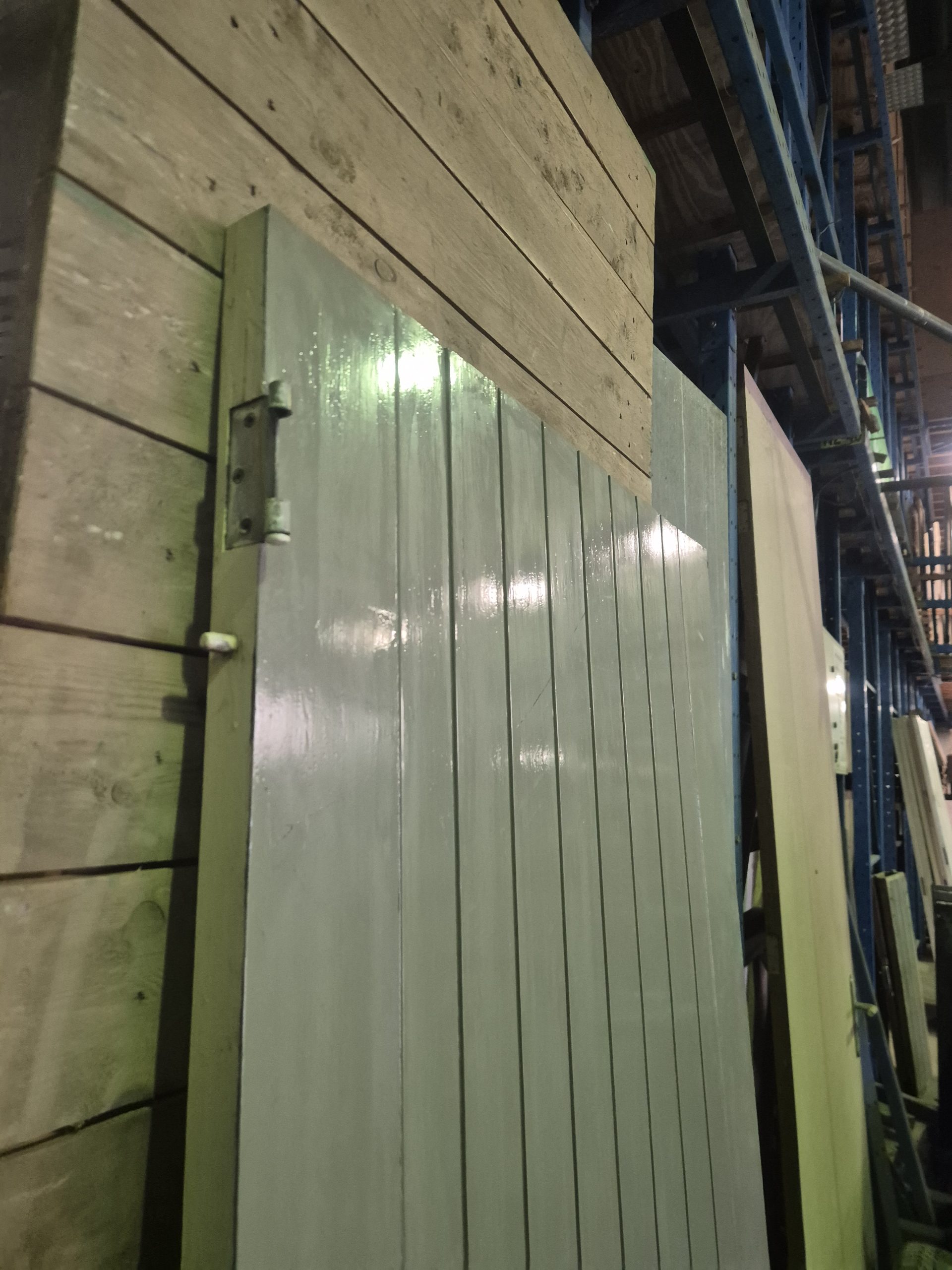 Buitendeur met latjes, het betreft een hardhouten deur. De deur heeft zijn deurklink nog.